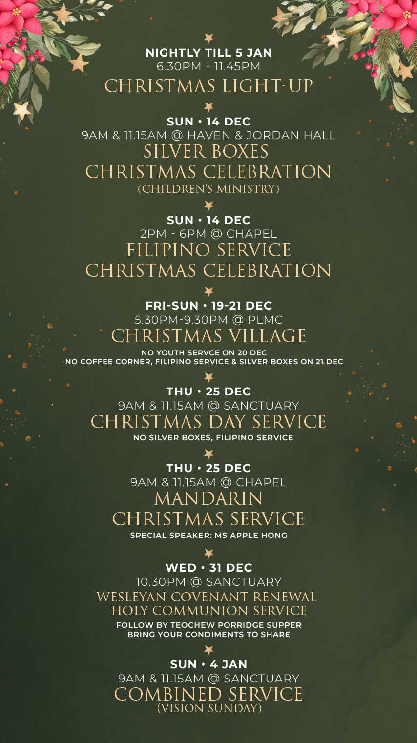 Please note the following: NO Youth Service on 20 Dec NO Children’s Ministry & Filipino Service on 21 and 25 Dec. NO Breakfast Counter on Sundays 21 and 28 Dec. There will be Teochew porridge supper after service on 31 Dec – do bring your favourite condiments to share!