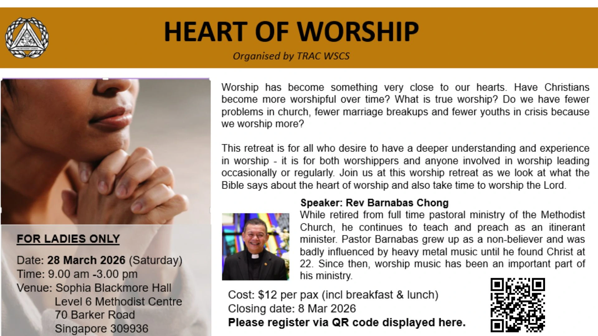 Heart of Worship (Ladies Only) Date: 28 March 2026 (Sat), 9.00am–3.00pm Venue: Sophia Blackmore Hall, Level 6 Methodist Centre